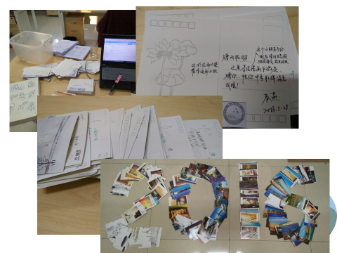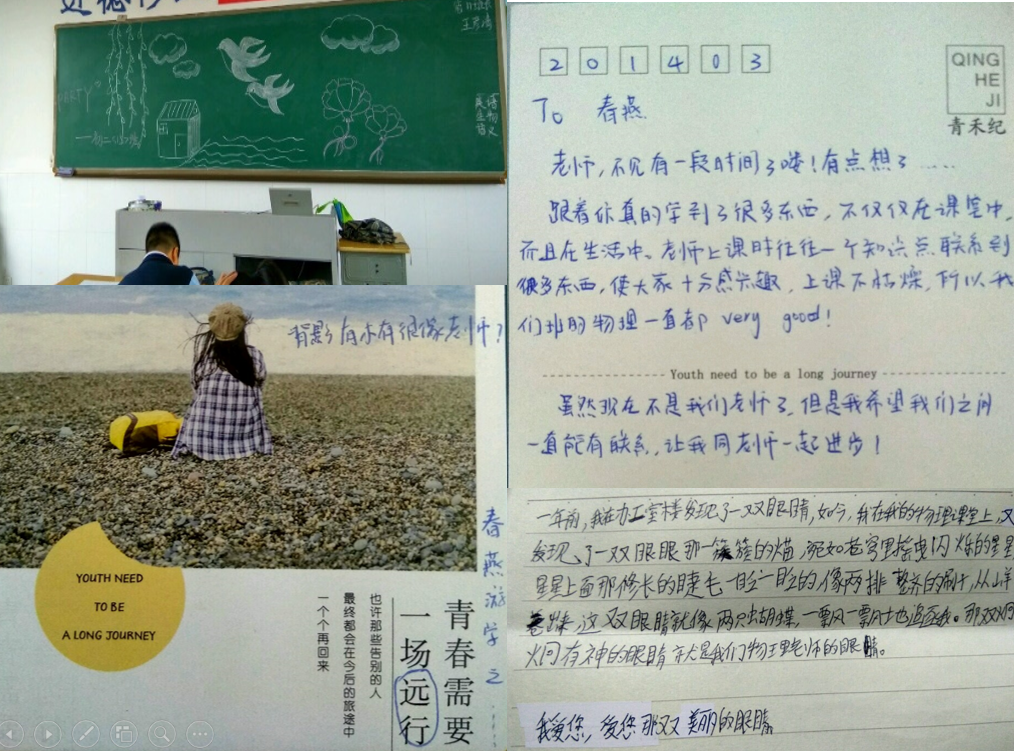 左上图学生为我开的“离别晚会”布景,学生看到这张明信片联想到春燕,还有右边的话,我们相约一起进步,右下图的话