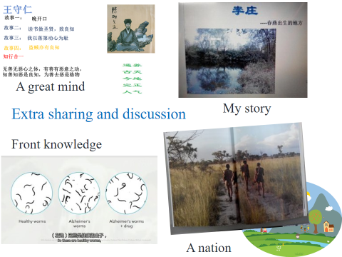 左上图,“通古今完人”课程中与学生分享的王阳明故事;右上图,我自己的故事,渗透乡村四季变化(秋收的季节,从田野里挖些新鲜的花生与学生分享);左下图,“科技前沿”课程中分享剑桥大学用线虫探究阿尔兹海默症病因的科学研究;右下图,介绍沙漠中的图阿格雷民族(知道一个民族的历史、苦难、对人类文明的贡献,有利于培养学生的国际视野和宽广胸怀)