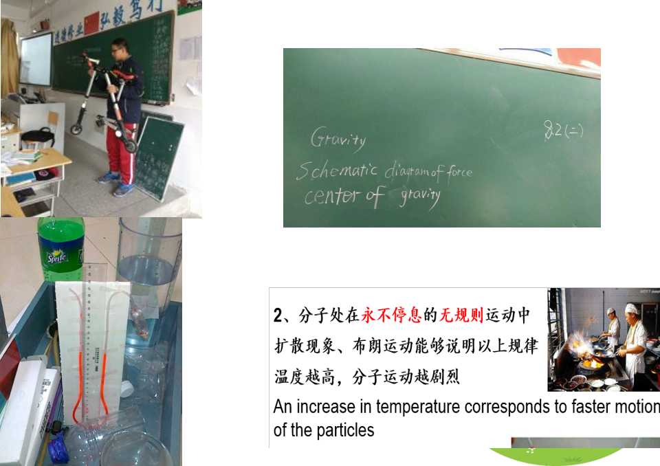 左上图,用自行车(这是当时世界上最小的自行车,学生们看到时觉得新奇有趣)贯穿摩擦力整节课内容、讲到“物质的物理属性”也用自行车贯穿整节课,图中颜邢同学正用它讲解自行车哪些地方增大摩擦力,左下图为用橡皮膜、瓶盖、塑料管等制成的液体压强计,右边两图为双语教学的部分内容