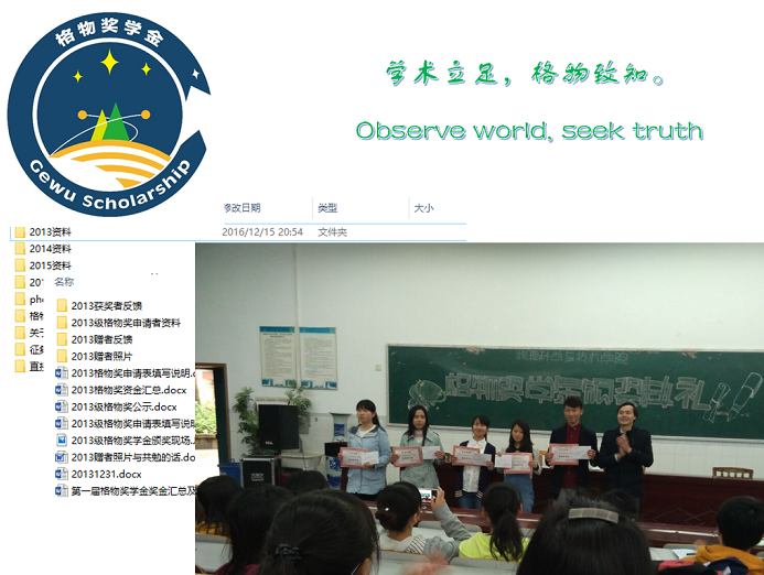 2、“格物奖学金”:奖励大一专业优异的新生。“学术立足,格物致知!”(在做,欲了解并捐赠的朋友,请发送邮件到gwj@oef.org.cn)