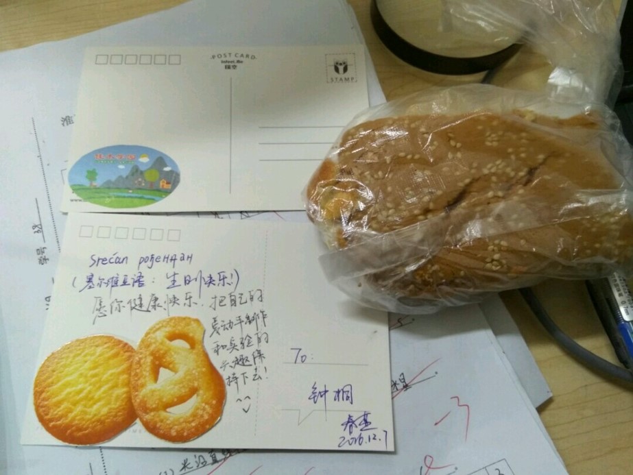 图为学生生日时,赠的蛋糕(从学校食堂买来的)、空白卡片,用塞尔维亚语写的“生日快乐”卡片(剪一些漂亮的图案粘上,当我们仔细去看生活中的一件物品时,即使是包装袋上的一块“饼干”,都那么美!),用“谷歌翻译”学习其他民族的语言,然后教给学生们,我真是赚大了,自从用这种方式给学生庆祝生日,学会了不同语言说“生日快乐”