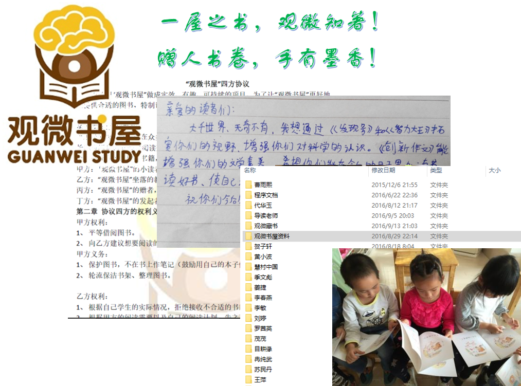 10、“观微书屋”:建立不同版本相互参照、常识体系完备、心境策略井然的小书屋。短期目标是为中西部的中小学生筹备书籍,注重文化交流,健康可持续地发展,长期目标是建立青少年阅读分享平台,“赠人书卷,手有墨香”(在做,欲了解并捐赠的朋友,请发送邮件到gws@oef.org.cn)